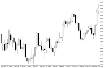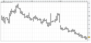 In a Bar chart, the open is indicated by a small dash ( – ) which is drawn on the left side of the Bar, and the close by another dash on the right side of the bar. In a Candlestick chart, the real body i.e. the 2 ends of the body, show the opening and the closing price for the given period. The lines at the top and bottom of the real body are called the shadows, and they denote the high and the low for that session. The colour of the body denotes the open and the close of that session. If the open to close is on the higher side i.e. it is a bullish candle, the colour of the candle is white and if it is bearish then the colour of the candle is black. In some packages, green and red are used instead of white and black.